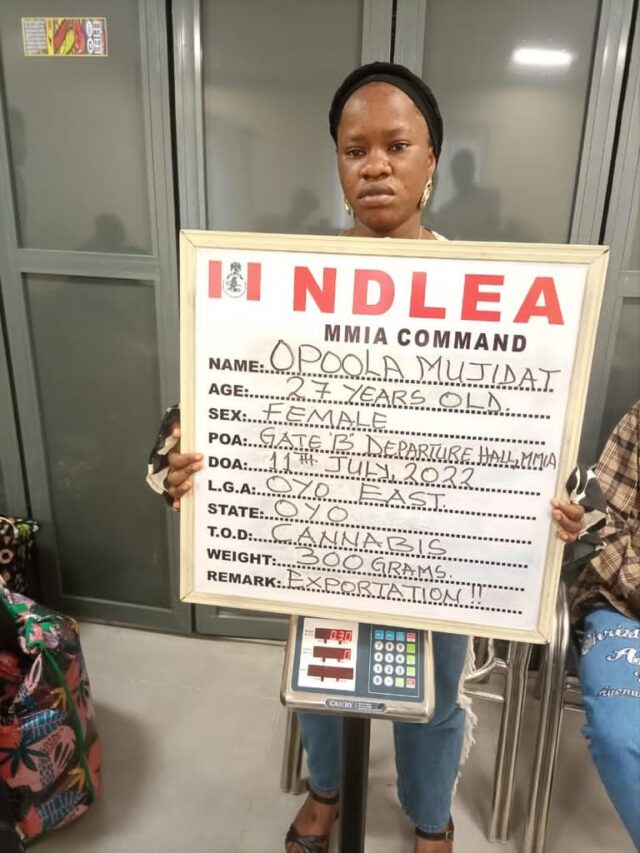 The National Drug Law Enforcement Agency, NDLEA, says its operatives have arrested one Mujidat Opoola for allegedly planting cannabis on two passengers at the Lagos airport.