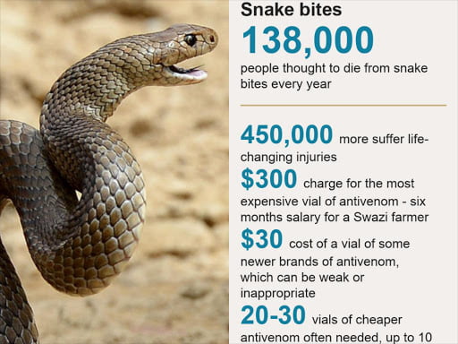 Every day, some 7,400 people are bitten, and between 220 and 380 die, adding up to about 2.7 million cases of poisoning each year.
