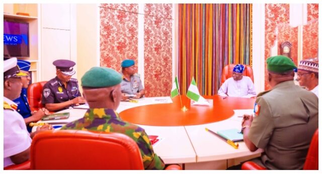 In attendance at the meeting include the Chief of Defence Staff, Maj. Gen. C.G Musa; the Chief of Army Staff, Maj. Gen T. A Lagbaja; the Chief of Naval Staff, Rear Admiral E. A Ogalla; and the Chief of Air Staff, AVM H.B Abubakar and The Inspector General of Police, Kayode Egbetokun,